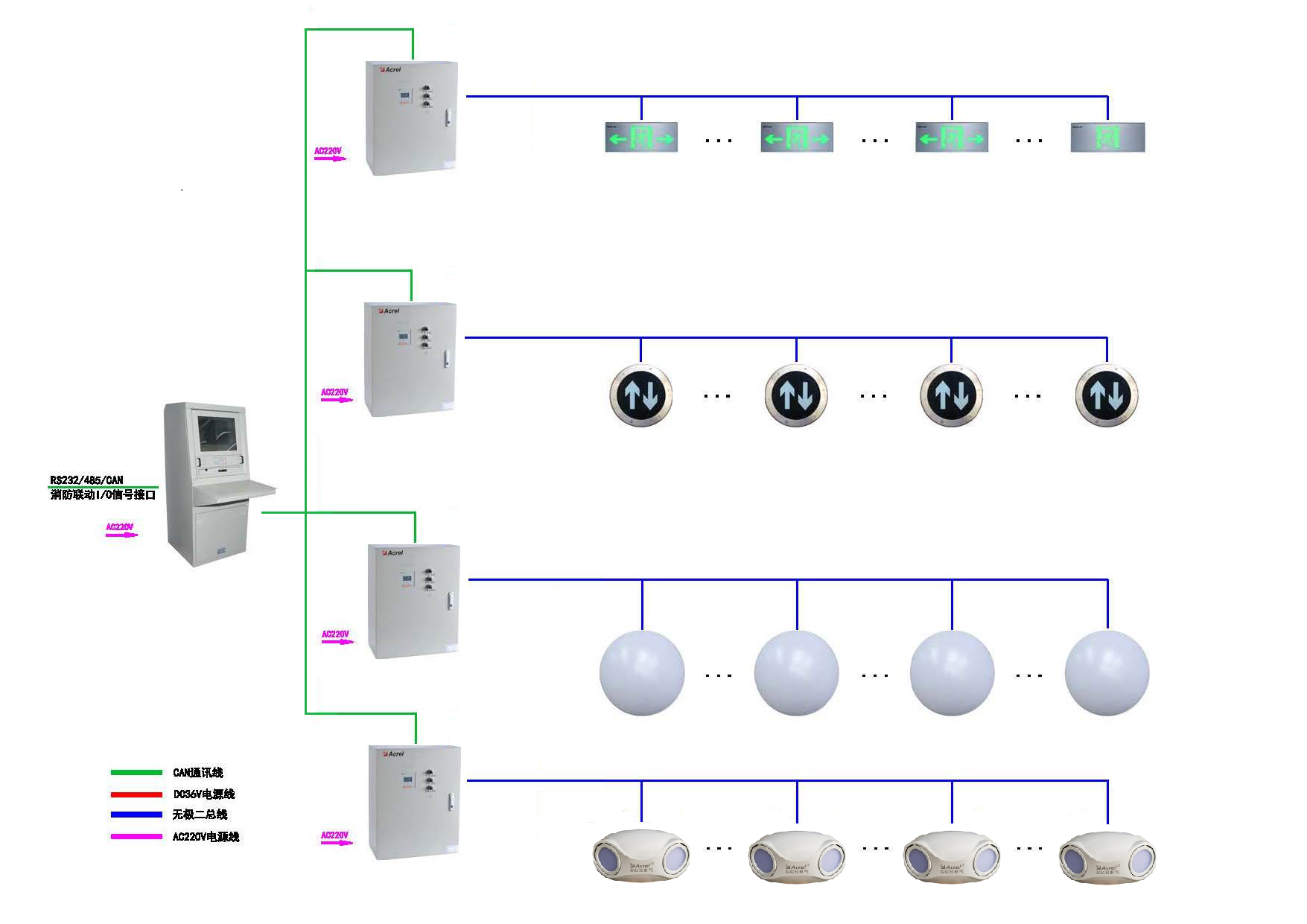 阿克蘇數據機房項目的消防應急照明和疏散指示系統是安科瑞研發的集監視、報警、管理于一體的計算機測控系統,該系統可以通過控制器接收火災報警系統的信號,當火災發生的時候,消防應急照明和疏散指示系統具有智能動態導光功能,系統根據火災報警聯動信號及災情現場的具體情況通過計算機選擇一條正確逃生路,再通過改變標志燈的箭頭方向為逃生人員提供更有效的疏散逃生路。當發生緊急斷電或電源供電不足時,應急照明集中電源能夠給燈具供電,保證整個系統的正常工作。該系統由控制器、集中電源、消防應急標志燈具和消防應急照明燈具等組成,系統結構合理、功能強大、可靠性高、維護方便。