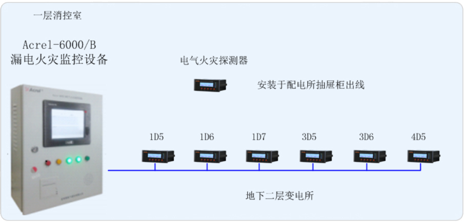 交通飯店有一個變電所,位于地下二層。變電所負責負一層超市以及地上樓層部分的用電。現為本項目設計一套漏電火災系統,由此來實時監測變電所內重要回路的漏電流,以確保變電所配電系統的電氣安全。