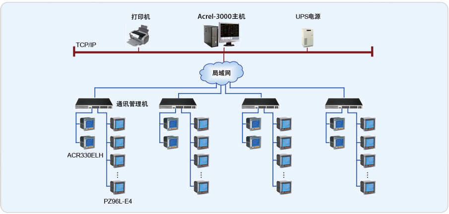 該系統(tǒng)總計(jì)有79只儀表(其中包括8只ACR330ELH諧波儀表,71只PZ系列智能儀表),分8條總線,由于四個(gè)變電所之間距離較遠(yuǎn),并且較為分散,采用每個(gè)變電所內(nèi)自行組網(wǎng),然后并入惠氏公司內(nèi)部局域網(wǎng)的方式,實(shí)該現(xiàn)場總線上儀表與監(jiān)控主機(jī)的數(shù)據(jù)連通。