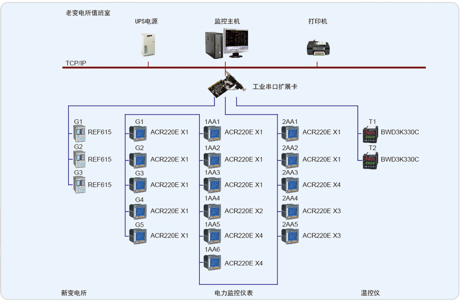 安科瑞電氣股份有限公司于2011年8月承接了蘇州軸承廠有限公司電力監控系統的設計與實施。本監控系統主要實現蘇州軸承廠有限公司的10/0.4kV配電系統進行用電監測與電能管理;監測范圍為新建變電所的T1、T2變壓器進線柜,聯絡柜,溫控儀,高壓側儀表及綜保進行遠程實時監控和電能管理。該系統總計有31只儀表(其中包括26只ACR220E,3只ABB,2只溫控儀),分3條總線,都是直接通過屏蔽雙絞線走管道拉至值班室連接到主機擴展卡上,實現總線上儀表與監控主機的數據連通。