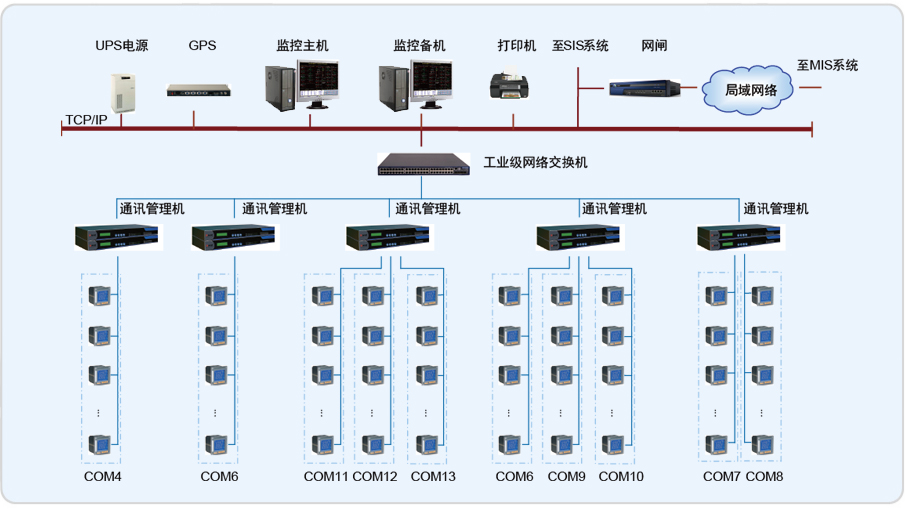 為了能實(shí)現(xiàn)對(duì)電廠電能量數(shù)據(jù)進(jìn)行自動(dòng)采集、遠(yuǎn)傳和存儲(chǔ)、預(yù)處理、線損統(tǒng)計(jì)及分析的電能綜合管理平臺(tái),合肥電廠電能量管理系統(tǒng)采用了Acrel-3000電能管理軟件,通過現(xiàn)場(chǎng)總線把現(xiàn)場(chǎng)的電能儀表進(jìn)行集中管理,做到了自動(dòng)采集、集中控制、智能管理。同時(shí)本電能管理系統(tǒng)還具備同廠內(nèi)SIS(監(jiān)控信息系統(tǒng))以及MIS(管理信息系統(tǒng))共享。