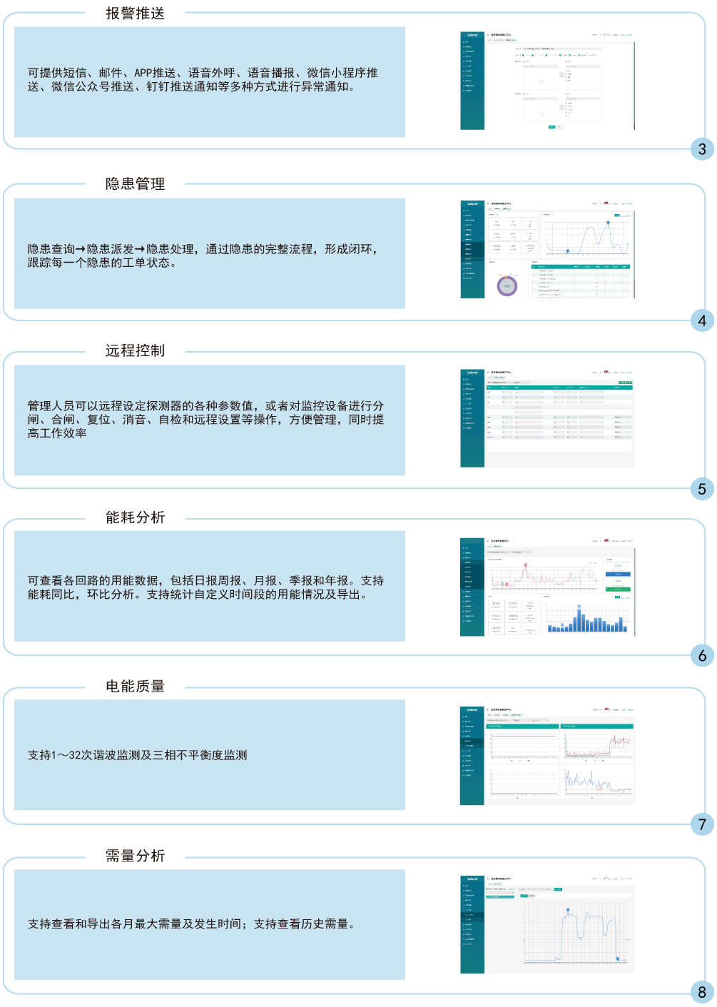 2.2、平臺能夠?qū)τ诒O(jiān)測點的電壓相序、電壓電流不平衡度、三相電流總諧波含量、三相電流2-31次諧波、三相電壓總諧波含量、三相電壓2-31次諧波、實時需量、最大需量都能夠進行有效監(jiān)控,為提高用電質(zhì)量提供依據(jù)。
