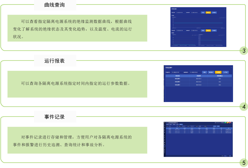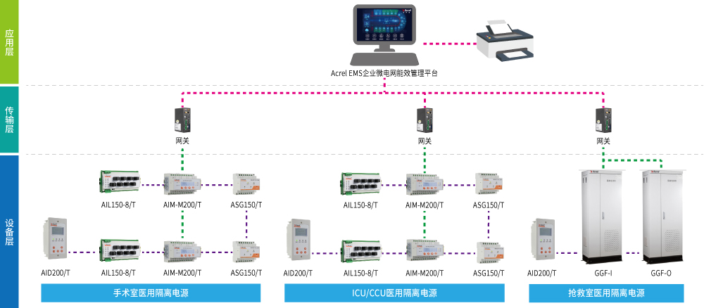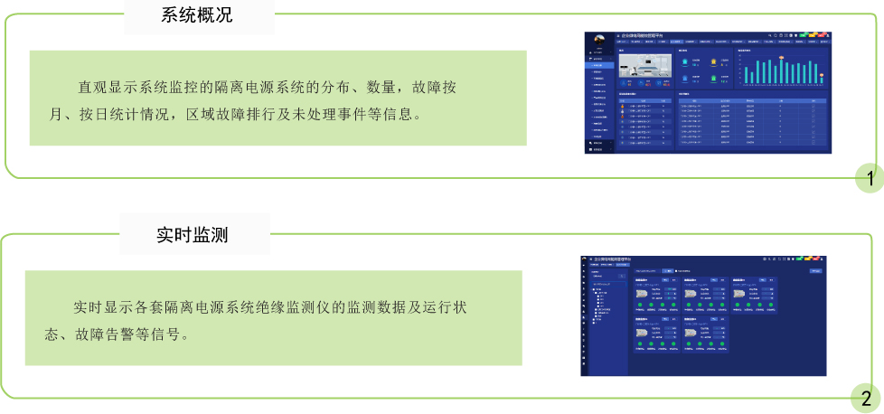 醫(yī)用隔離電源監(jiān)控系統(tǒng)用于集中監(jiān)控醫(yī)院門急診樓、住院樓內(nèi)所有醫(yī)療2類場所醫(yī)用隔離電源系統(tǒng)的運行狀態(tài),實時監(jiān)測各系統(tǒng)的絕緣狀況、負(fù)載率及變壓器的運行溫度。一旦某套隔離電源系統(tǒng)出現(xiàn)故障,能發(fā)出報警信息,提醒工作人員及時排查故障,消除隱患,保障各醫(yī)用隔離電源的安全可靠運行。