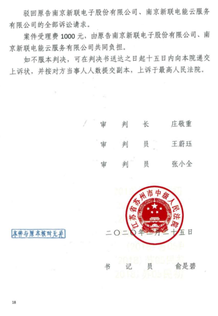 近日安科瑞收到江蘇省蘇州市中級人民法院(以下簡稱“蘇州中院”)的《民事判決書》((2018)蘇 05 民初 1000 號),就原告南京新聯電子股份有限公司、南京新聯電能云服務有限公司(以下簡稱“新聯公司”)與被告安科瑞電氣股份有限公司、江蘇安科瑞電器制造有限公司(以下簡稱“安科瑞”)侵害發明專利權糾紛一案作出判決。